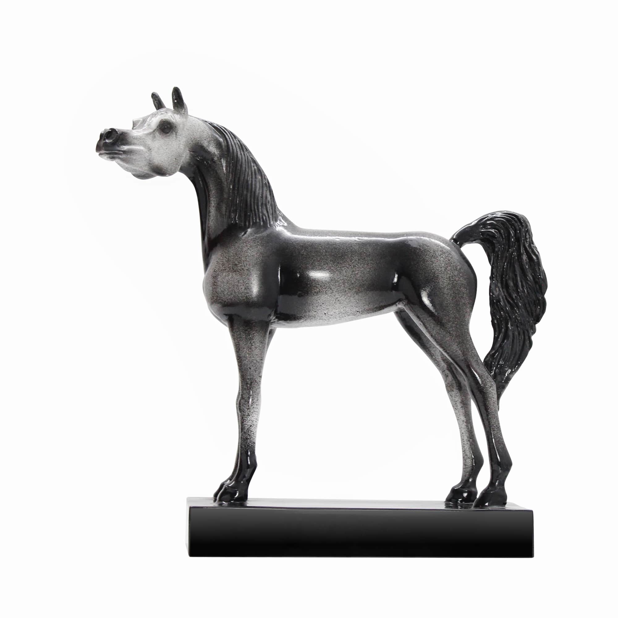 Embrace the beauty and grace of the Arabian horse with this stunning Black Arabian Horse Figurine. Known for its strength and elegance, the Arabian horse is a symbol of pride and heritage across the Middle East. This meticulously crafted figure captures every detail, from its proud stance to its flowing mane and tail. Mounted on a sleek black base, this elegant Black Arabian Horse Figurine can be displayed as-is or personalized with a custom message for a special occasion. Perfect for collectors, equestrian enthusiasts, or as a unique corporate gift, this Arabian horse statue is a timeless addition to any home or office.