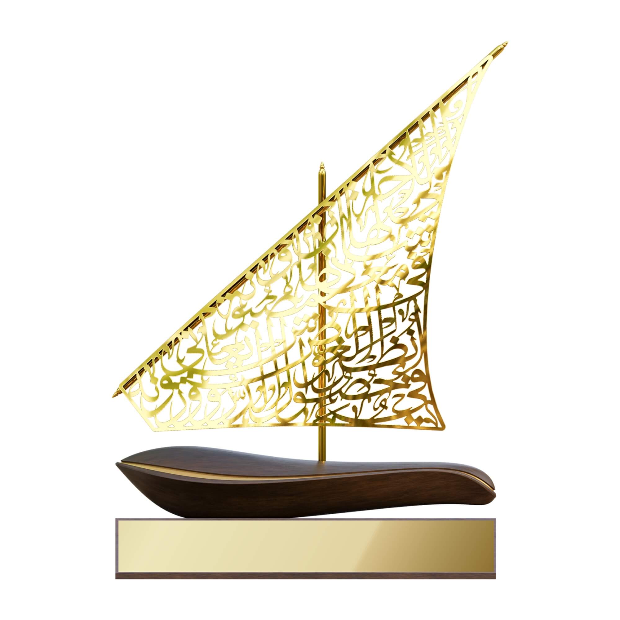 Celebrate UAE’s maritime legacy with this exquisitely crafted Traditional Dhow Sculpture, featuring a gold-finished sail adorned with Arabic calligraphy from a poem by His Highness Sheikh Zayed bin Sultan Al Nahyan. The flowing verses beautifully capture the spirit of navigation and pearl diving, engraved in elegant metal script: