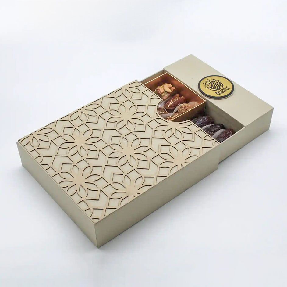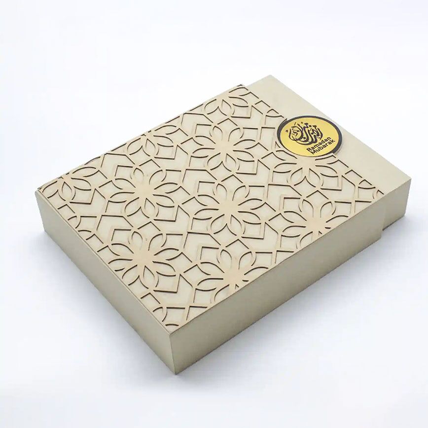Unveil a touch of luxury with this Ramadan Islamic Motif Gift Box featuring a laser-cut leather motif on the lid. Within the drawer lies 850 g of premium dates or chocolates. Thoughtful debossing adds an upscale finish, making it a perfect gift to spread festive cheer.