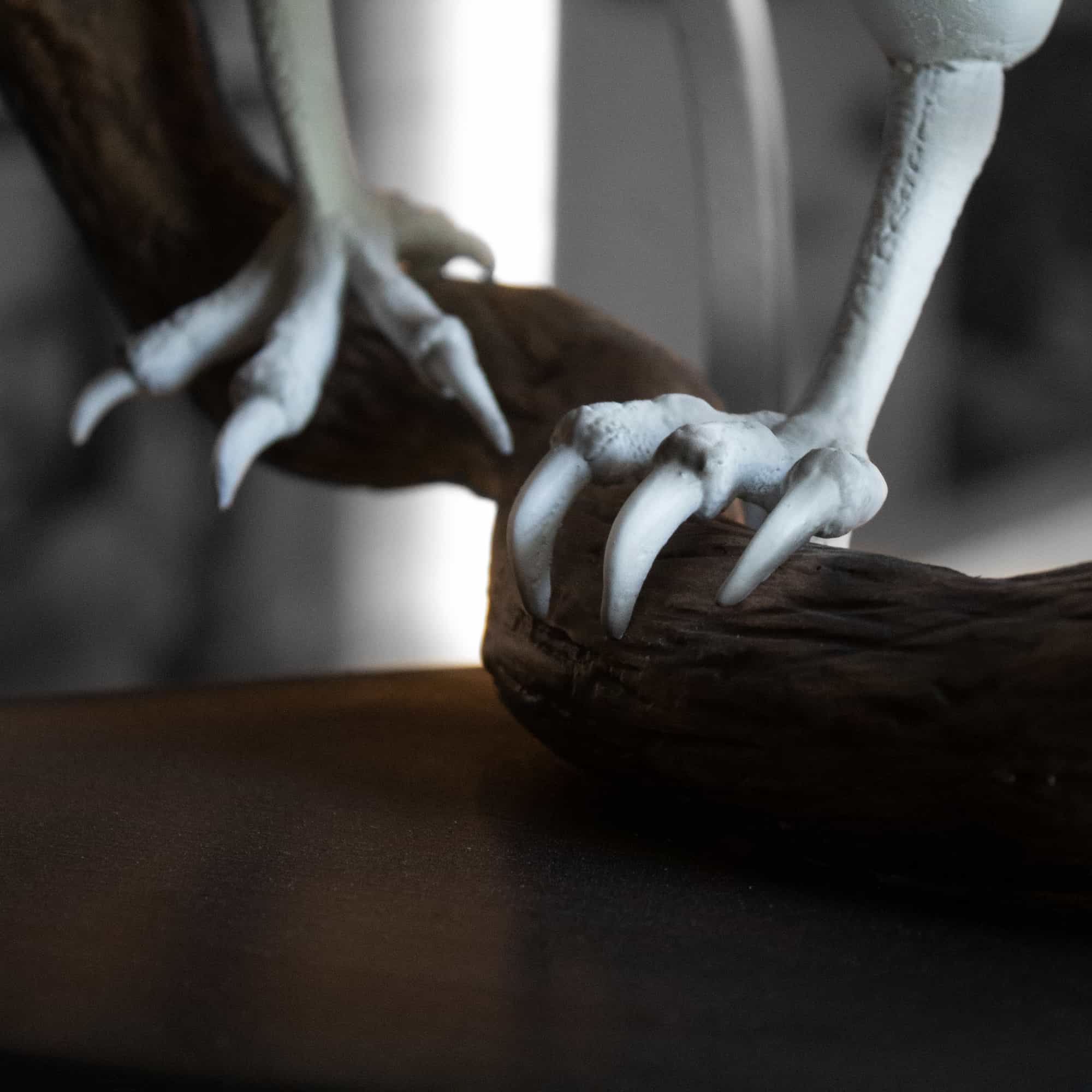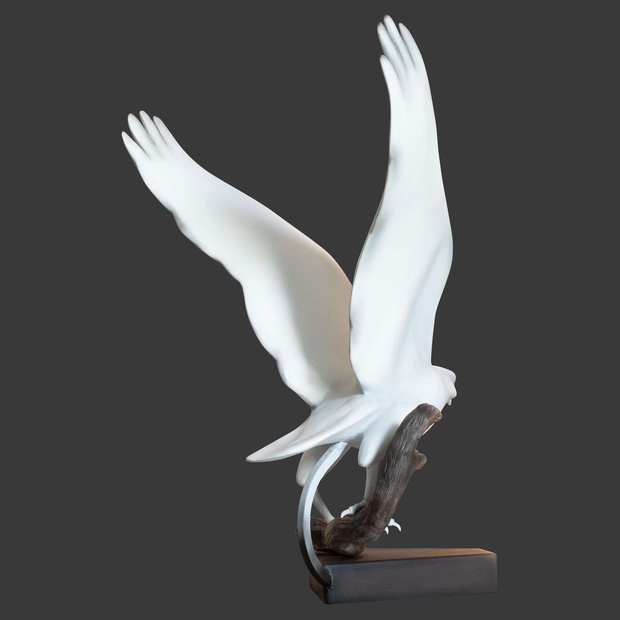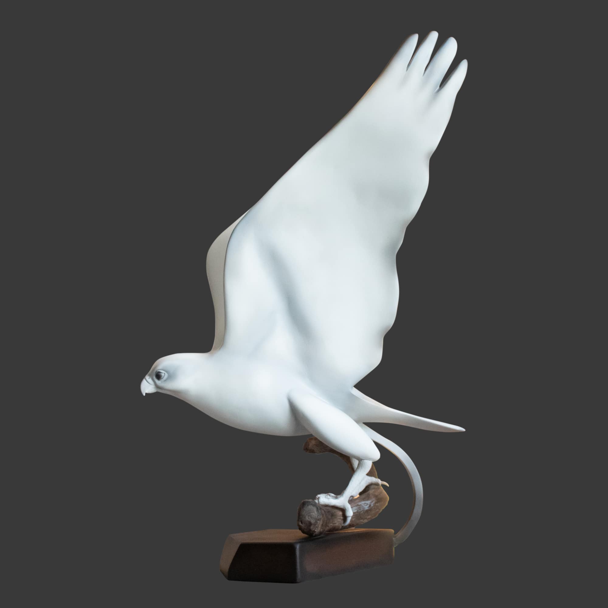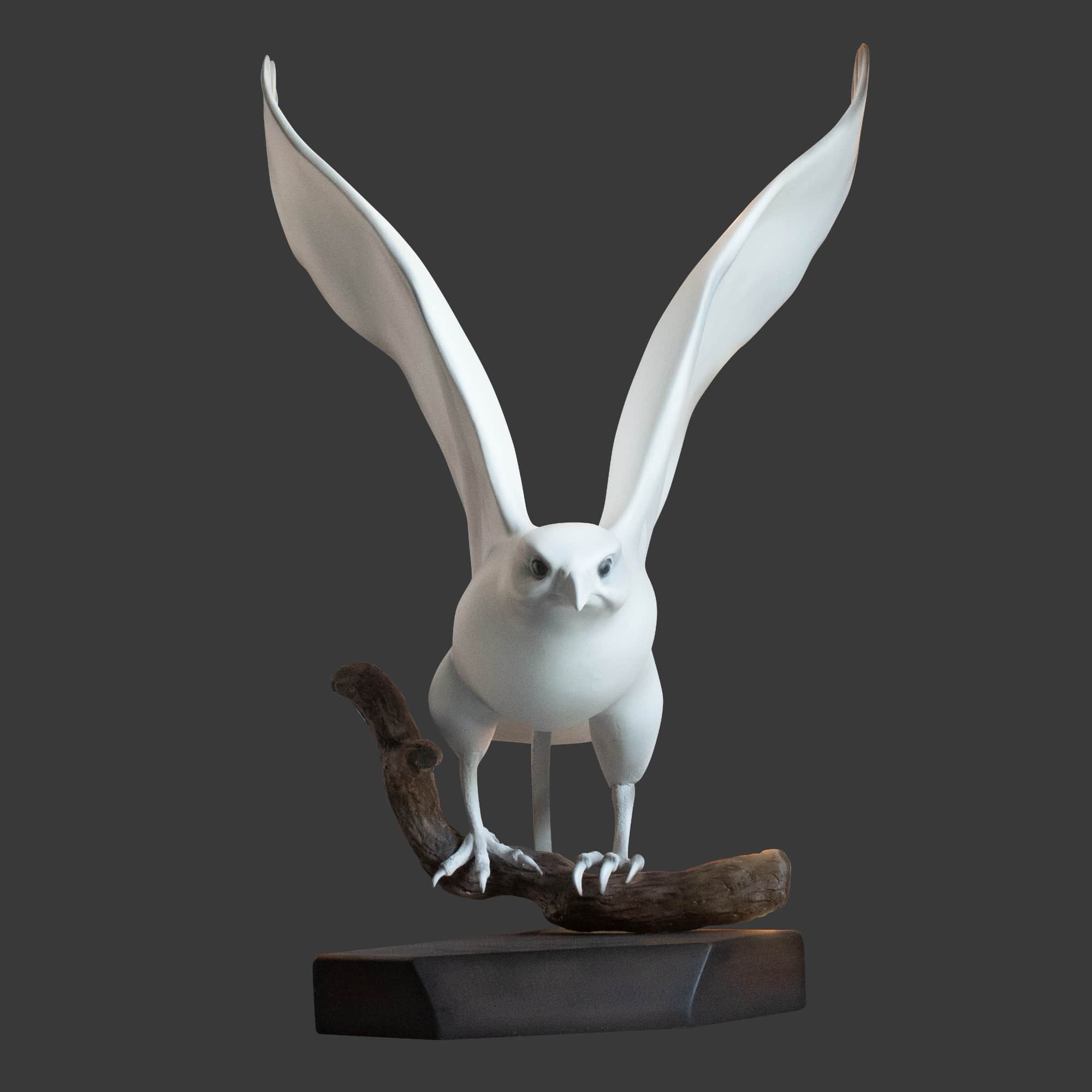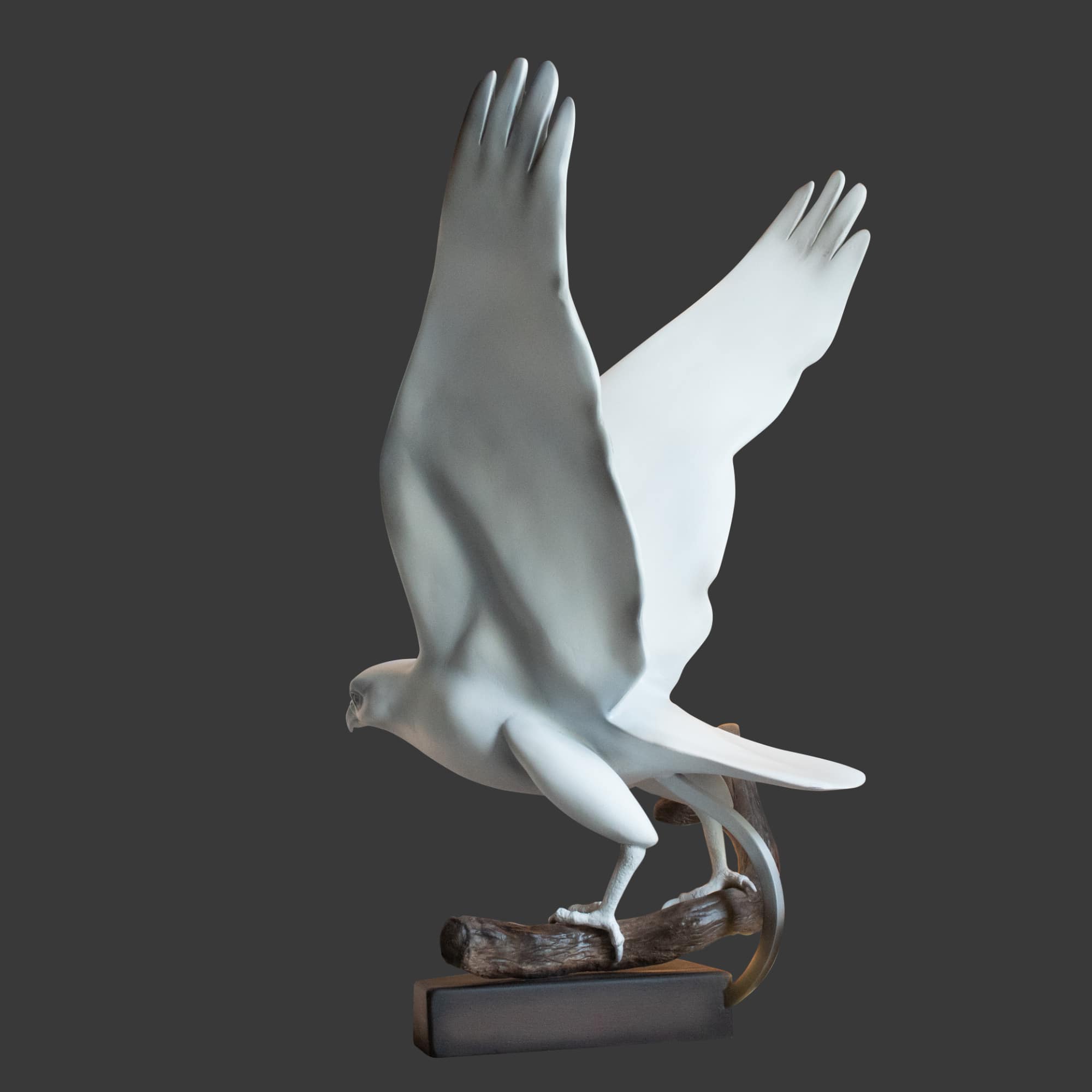 This dynamic 3D white peregrine falcon sculpture captures the majestic bird mid-takeoff from a tree branch.